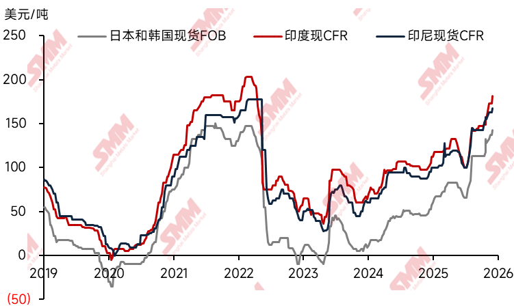 重重阴影下,国际市场硫酸价格普遍上涨。据悉,日本和韩国现货FOB在2026年已涨至125美元/吨,较2026年年初的105美元/吨上涨近20%;印尼现货CFR达到175美元/吨,印度CFR也升至165美元/吨。然而,中国冶炼酸FOB指数自2025年11月以来连续5个月却稳定在125美元/吨。这一“内外脱钩”现象背后,是政策、行业、企业三方合力构筑的“防火墙”。