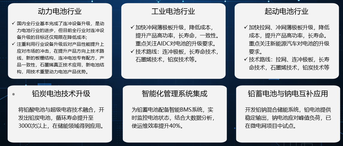 铅酸电池综合性能提升:全行业注重铅电池技术提升,在低速EV,汽车启动,工业备用,新兴储能市场提升电池能量密度,提升电池寿命,注重电池绿色全生命周期性能;