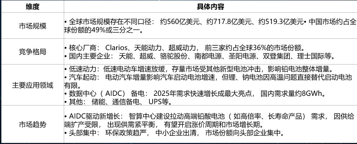 天能、超威、骆驼等企业主导市场,行业集中度持续提升,存量博弈特征明显。