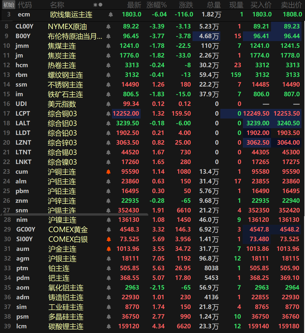 此外,碳酸锂主连涨4.34%,多晶硅主连涨2.77%,工业硅主连涨1.74%。欧线集运主连跌6.04%报1803。