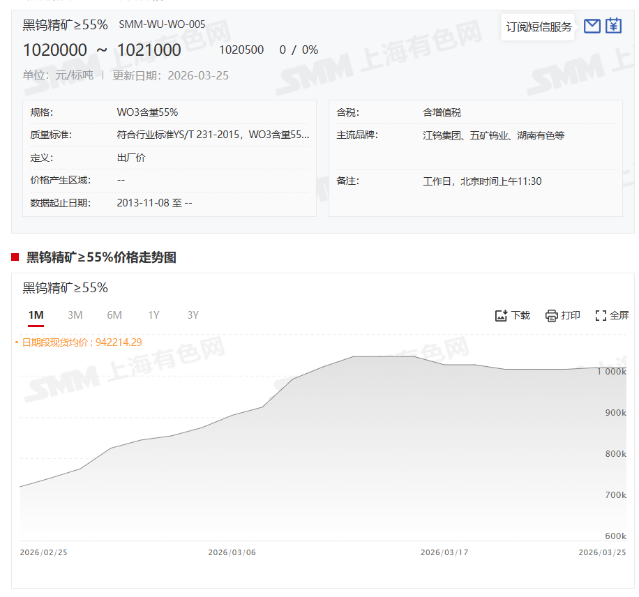 黑钨精矿均价于3月12日触及1047500元/标吨历史新高,2026年以来累计涨幅高达130.98%,此后钨市逐步从单边上行转向持稳盘整阶段。3月25日,黑钨精矿(≥65%)价格为1020000~1021000 元/标吨,其均价报1020500元/标吨,较前一交易日持平。而1020500元/标吨这一均价与其1047500元/标吨的历史高点比,下调了27000元/标吨,跌幅为2.58%。不过,1020500元/标吨这一均价与其2025年12月31日的均价453500元/标吨相比,其均价上涨了567000元/标吨,涨幅依然高达125.03%。