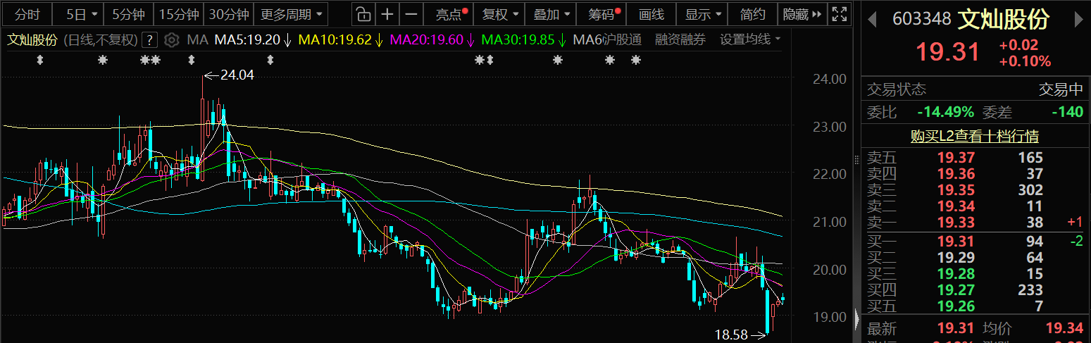 3月26日,文灿股份股价出现上涨,截至26日10:54分,文灿股份涨0.1%,报19.31元/股。