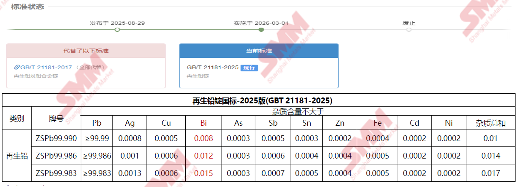 2025年8月,国家市场监督管理总局、国家标准化管理委员会联合发布了《再生铅锭(GB/T21181—2025)》,代替《再生铅及铅合金国标(GBT 21181-2017) 》,并已于2026年3月1日起正式实施。