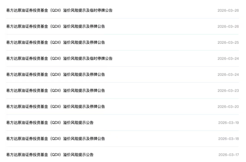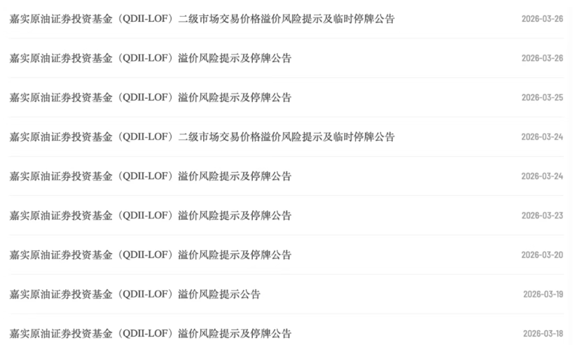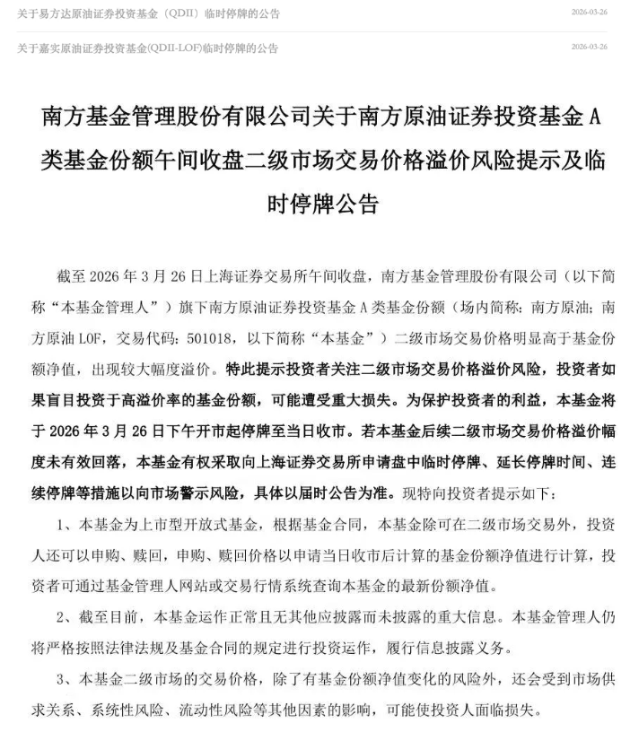 3月26日午间,深交所发布公告,嘉实原油LOF、原油LOF易方达,因二级市场溢价幅度未回落,于当天下午开市起至收市实施临时停牌。此外,南方基金也发布公告,截至3月26日上交所午间收盘,南方原油LOF二级市场交易价格明显高于基金份额净值,出现较大幅度溢价,于当天下午开市起停牌至当日收市。