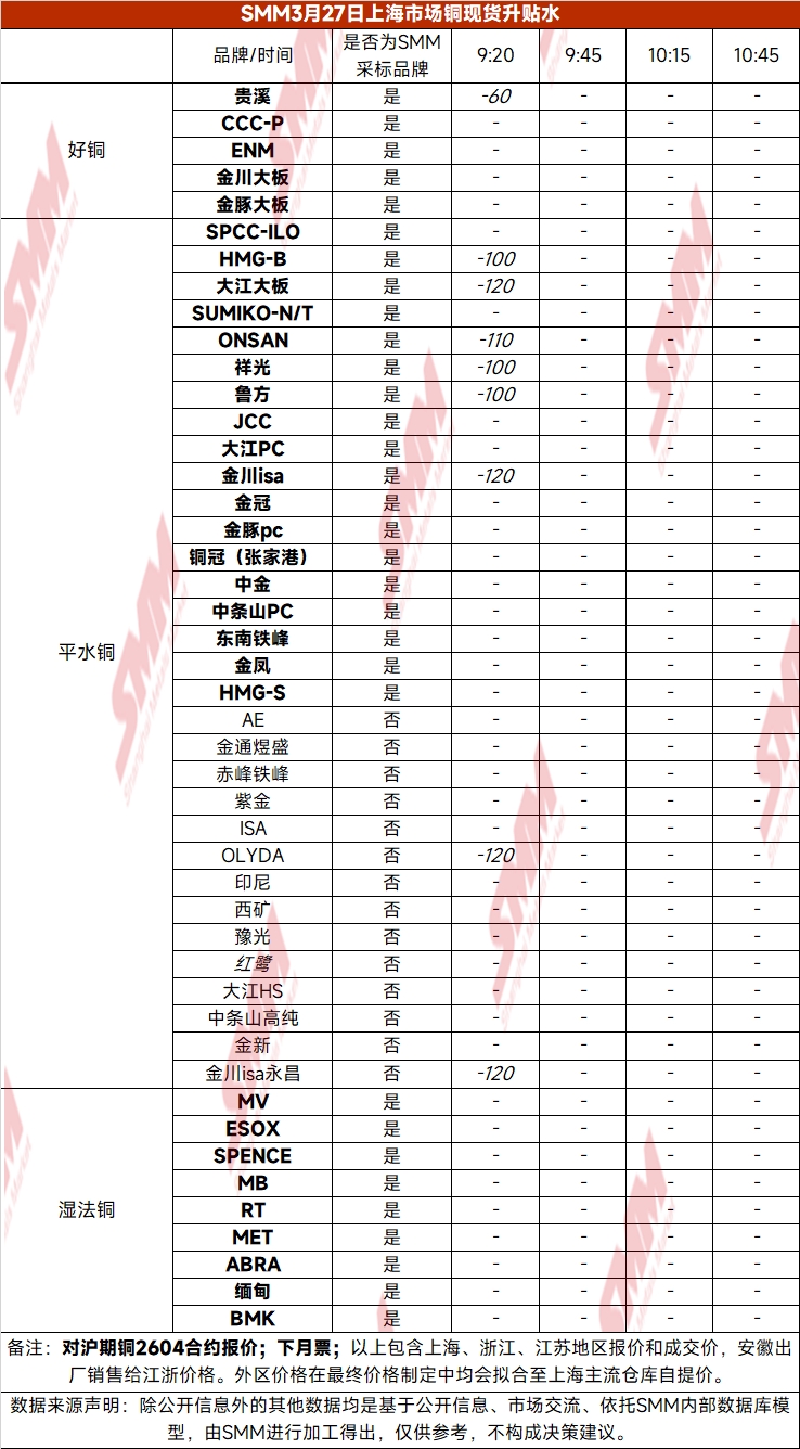 3月27日上海市场铜现货升贴水(第一时段)【SMM价格】