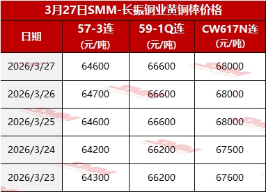 【SMM价格】2026年3月27日长振黄铜棒价格