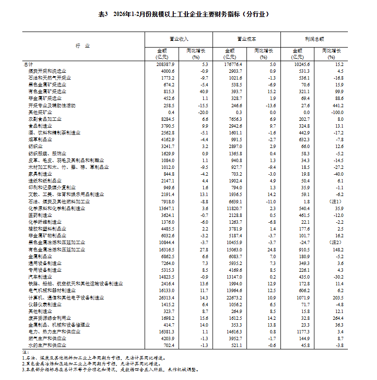 2026年1—2月份全国规模以上工业企业利润增长15.2%