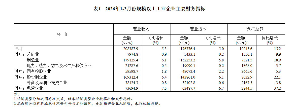 国家统计局的数据显示: 1—2月份,全国规模以上工业企业实现利润总额10245.6亿元,同比增长15.2%。1—2月份,规模以上工业企业中,国有控股企业实现利润总额3665.6亿元,同比增长5.3%;股份制企业实现利润总额8032.9亿元,增长22.1%;外商及港澳台投资企业实现利润总额2167.5亿元,下降3.8%;私营企业实现利润总额2844.5亿元,增长37.2%。1—2月份,采矿业实现利润总额1556.1亿元,同比增长9.9%;制造业实现利润总额7321.5亿元,增长18.9%;电力、热力、燃气及水生产和供应业实现利润总额1368.0亿元,增长3.7%。国家统计局工业司首席统计师于卫宁解读2026年1—2月份工业企业利润数据。