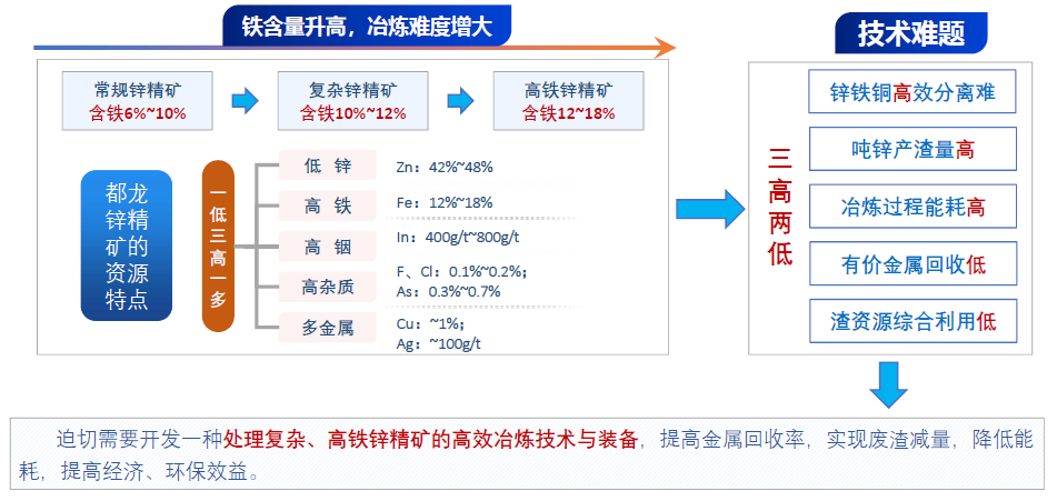 我国锌资源丰富(截止2022年的锌矿储量约为4608万吨),但富矿少,伴生矿多、禀赋差,复杂多金属锌矿占总量的65% ,其中高铁锌精矿占比最高、冶炼难度大。