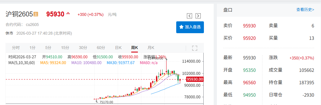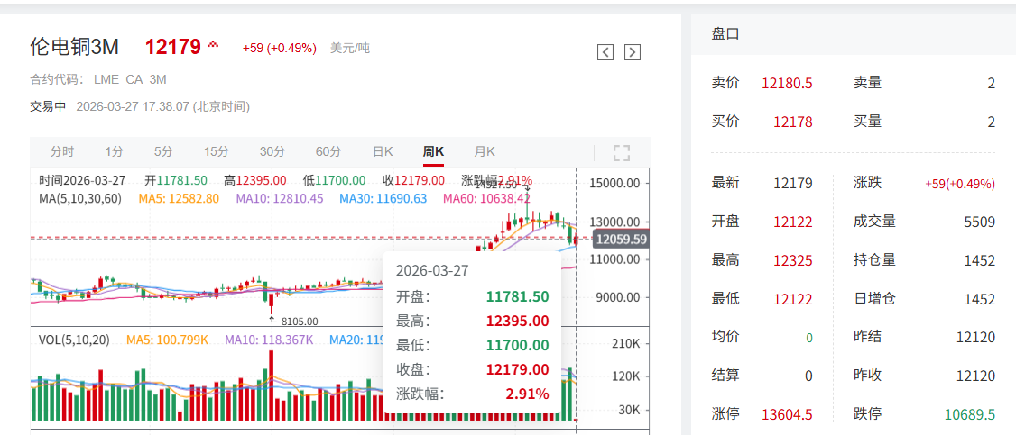 本周中东地缘局势受相关各方表态影响,对铜价走势形成扰动。美元指数周初阶段性回落,在一定程度上修复了市场风险偏好,随着下游逢低补库意愿有所回升,国内铜库存持续去库,推动铜价告别周线三连跌,本周伦沪铜周线收阳。截至3月27日17:38分,伦铜涨0.49%,报12179美元/吨,其周线收阳,当周周线暂时涨2.91%;沪铜主力合约涨0.37%,报95930元/吨,其周线收阳,当周周线涨1.26%。