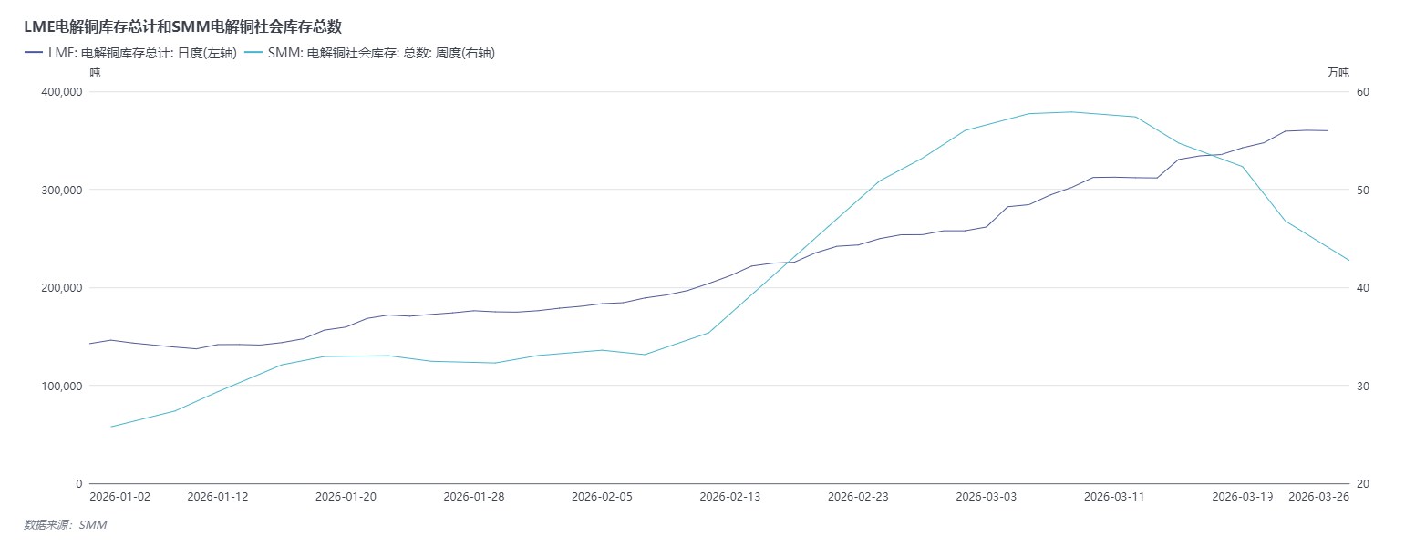 国内库存方面:截至3月26日周四,SMM全国主流地区铜库存环比上周四下降18.29%,总库存同比去年同期增加9.29万吨,已连续两周呈现去库态势……》点击查看详情