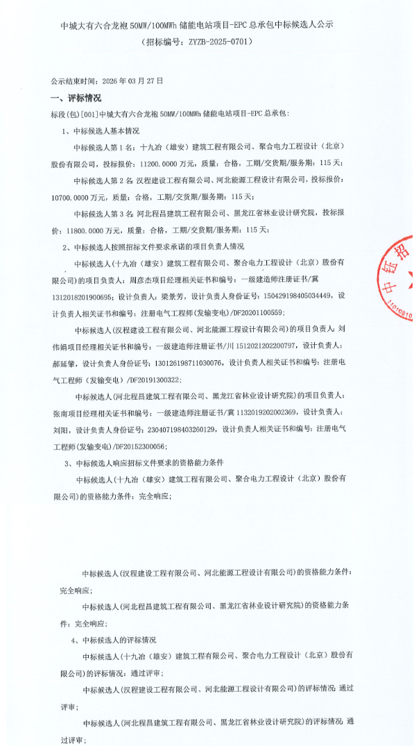 第一中标候选人为十九冶(雄安)建筑工程有限公司与聚合电力工程设计(北京)股份有限公司联合体,投标报价11200万元,折合单价约1.120元/Wh。前者为中国中冶(601618.SH/01618.HK)权属十九冶集团的全资子公司,隶属于五矿集团;后者聚合电力为香港上市公司协合新能源集团的控股子公司,累计设计咨询/总承包风力发电容量50GW以上、光伏电站18GW以上、储能容量7GW以上。