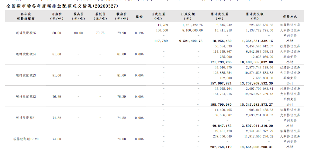 2026年1月1日至3月27日,全国碳市场碳排放配额成交量19,562,221吨,成交额1,468,180,065.75元。