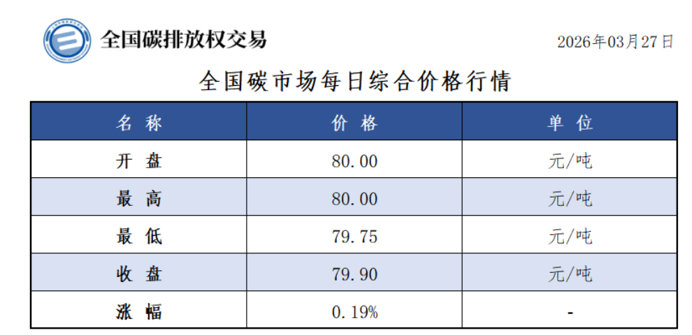 今日全国碳市场综合价格行情为: 开盘价80.00元/吨,最高价80.00元/吨,最低价79.75元/吨,收盘价79.90元/吨,收盘价较前一日上涨0.19%。