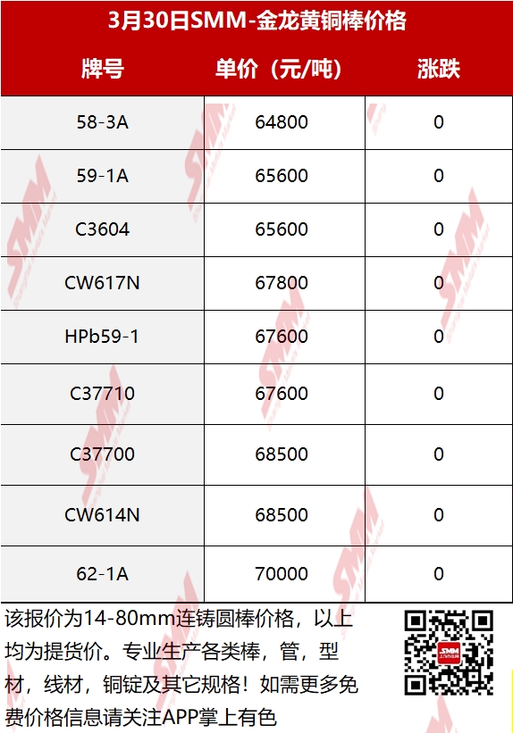 【SMM价格】2026年3月30日金龙黄铜棒价格
