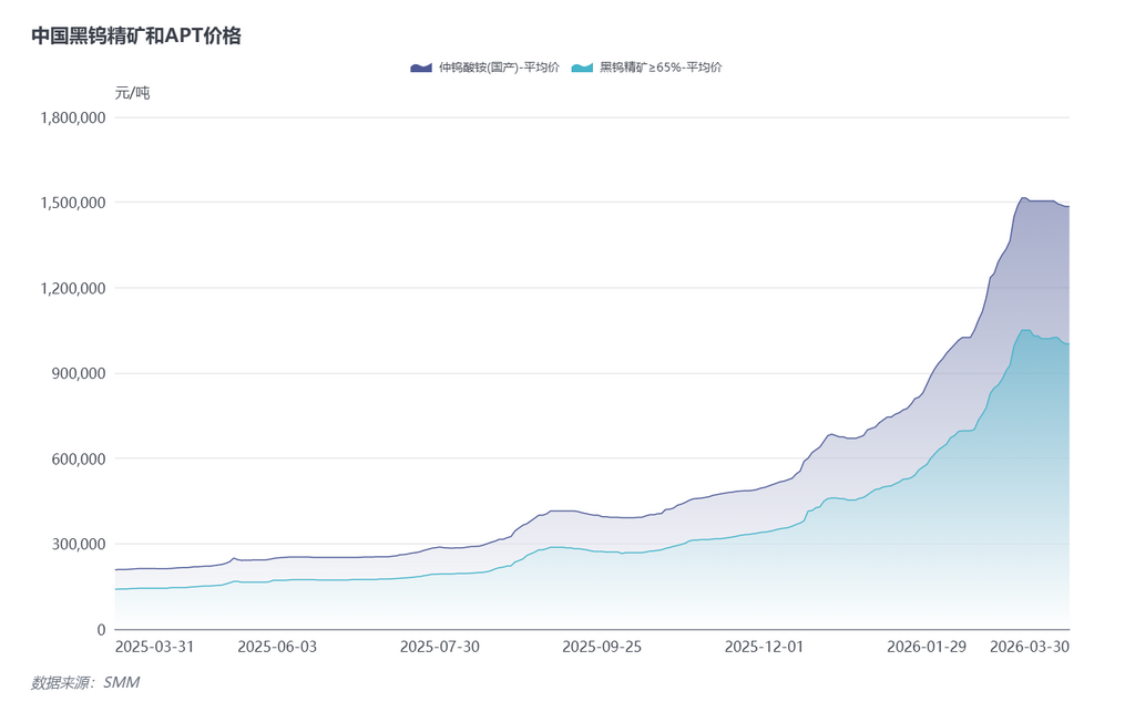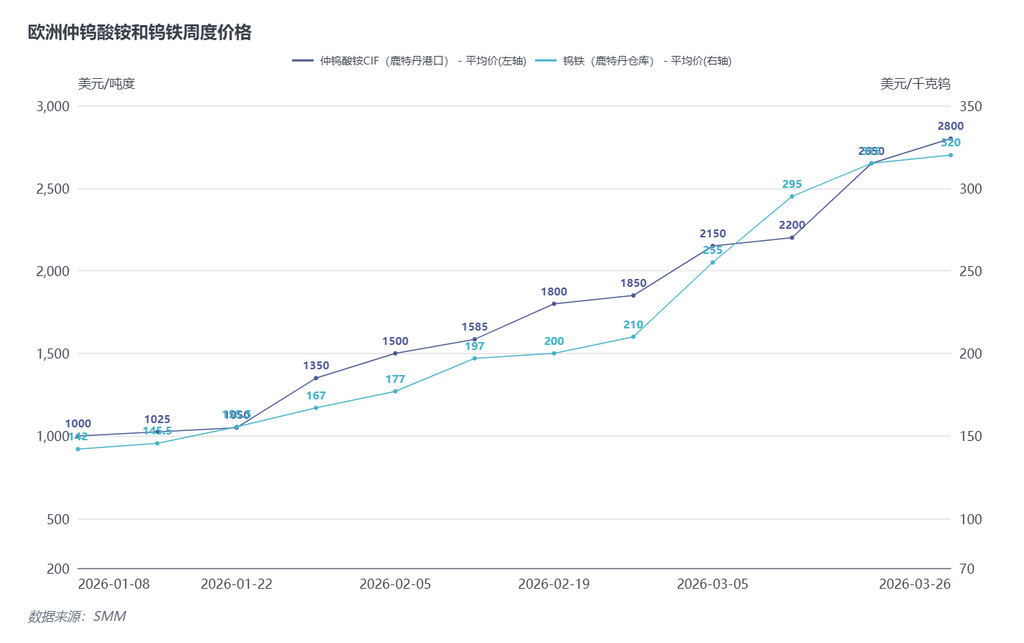 据SMM数据显示,截至3月30日,仲钨酸铵(APT)CIF鹿特丹港口报价为2600-3000美元/吨度,均价2800美元/吨度,较上周上涨150美元;钨铁(鹿特丹仓库)报价为310-330美元/千克钨,均价320美元/千克钨,较上周上涨5美元。上周欧洲市场成交整体偏少,但原料供应紧张态势持续支撑报价小幅上移,3月末欧洲APT价格较月初累计涨幅已达30%。