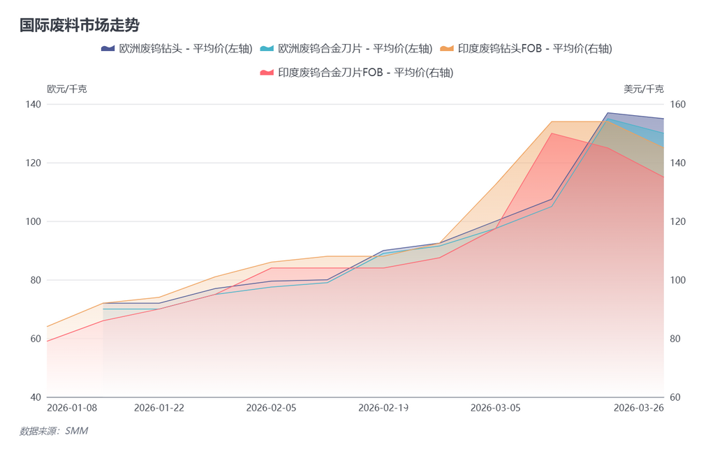 截至3月26日,欧洲废钨市场整体震荡趋稳。欧洲废钨合金刀片报价125-135欧元/千克,均价130欧元/千克,较上周下调5欧元;废钨钻头报价135欧元/千克。上周价格经历小幅下跌后,本周逐步企稳。印度废钨市场则连续两周走弱,废钨钻头FOB报价140-150美元/千克,废钨合金刀片FOB报价130-140美元/千克,较上周下滑6.8%。