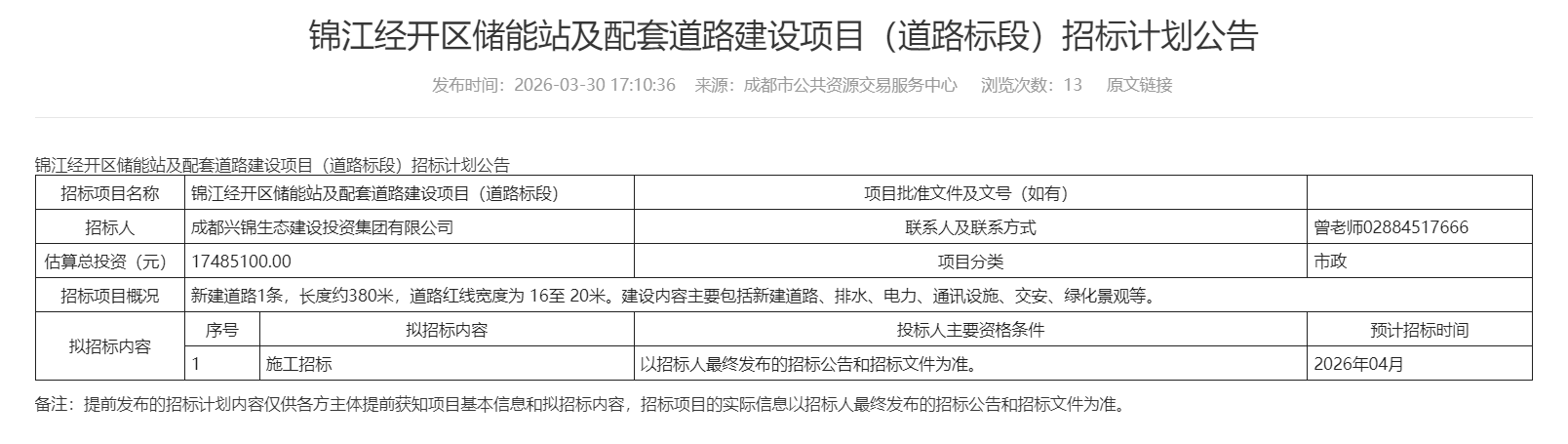 近日,锦江经开区储能站及配套道路建设项目(道路标段)发布招标计划公告,招标内容包括新建道路1条,长度约380米,道路红线宽度为 16至 20米。建设内容主要包括新建道路、排水、电力、通讯设施、交安、绿化景观等。估算总投资额17485100.00元,预计招标时间2026年04月。