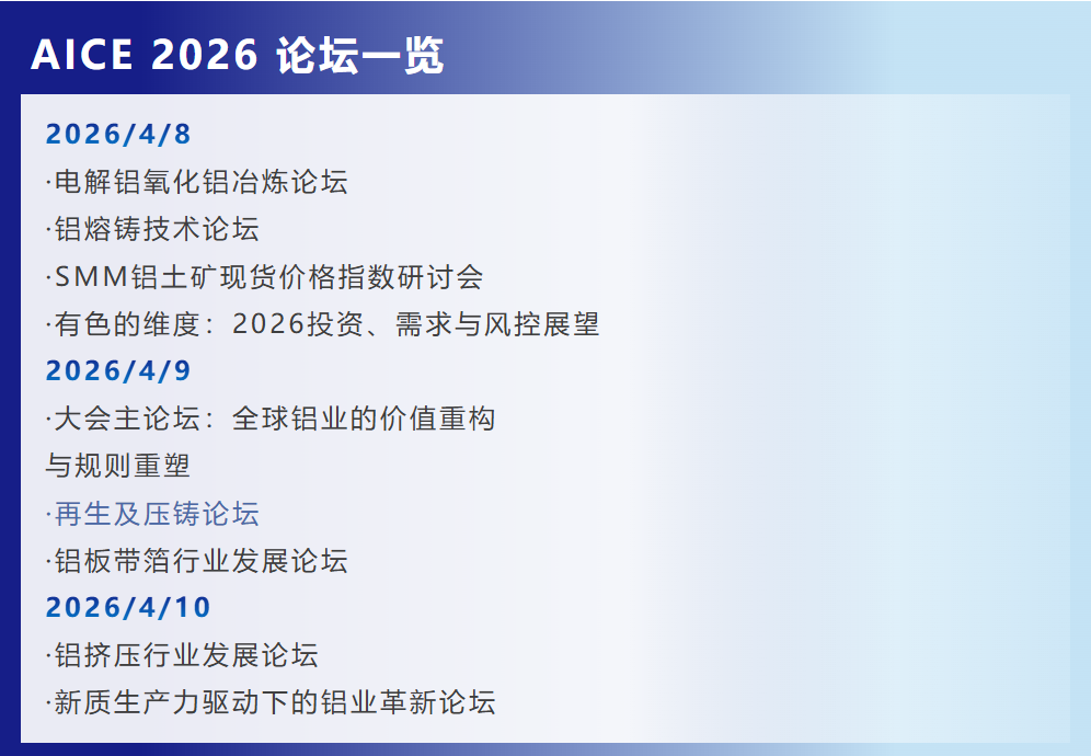 4月8-10日苏州国际博览中心举行的SMM 2026(第二十一届)铝业大会暨铝产业博览会期间,SMM特别设立 《再生铝及压铸论坛》,旨在直面资源约束、市场波动、技术变革,展开一场深度、务实、前瞻的产业对话。