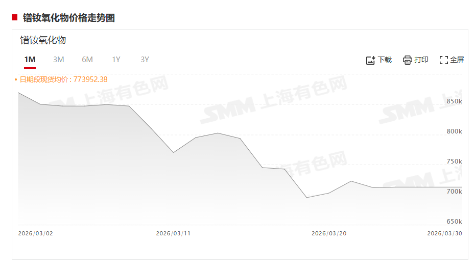 据SMM报价显示,3月30日,氧化镨钕价格为710000~715000元/吨,其均价为712500元/吨,较前一交易日持平。