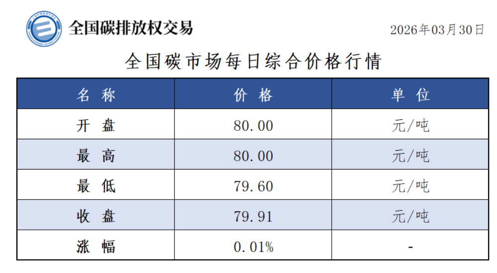 今日全国碳市场综合价格行情为: 开盘价80.00元/吨,最高价80.00元/吨,最低价79.60元/吨,收盘价79.91元/吨,收盘价较前一日上涨0.01%。