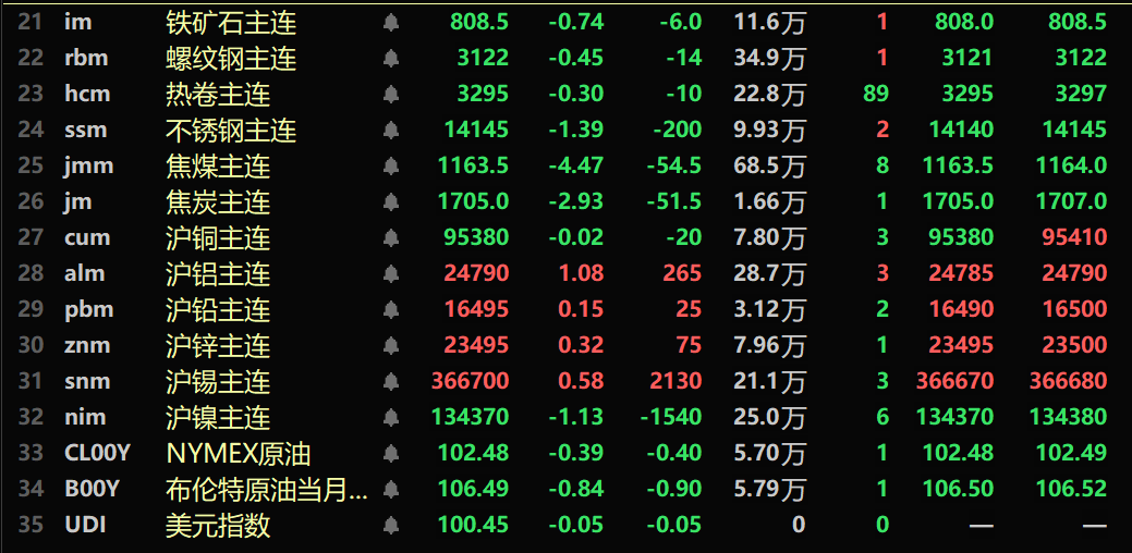 黑色系均飘绿,铁矿跌0.74%,螺纹跌0.45%,热卷跌0.3%,不锈钢跌1.39%。双焦方面:焦煤主力合约跌4.47%,焦炭主力合约跌2.93%。