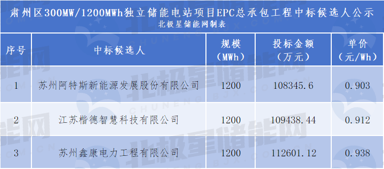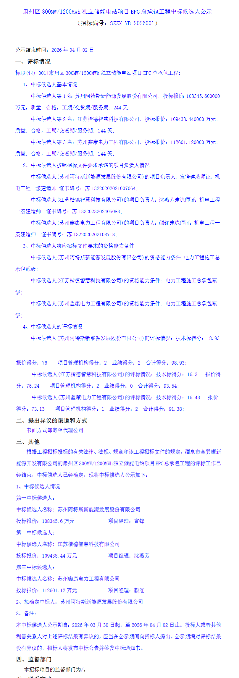 北极星储能网讯:2026年3月30日,甘肃肃州区300MW/1200MWh独立储能电站项目EPC总承包工程中标候选人公示,前三名中标候选人依次为苏州阿特斯新能源发展股份有限公司、江苏楷德智慧科技有限公司、苏州鑫康电力工程有限公司,投标单价在0.903~0.938元/Wh之间。
