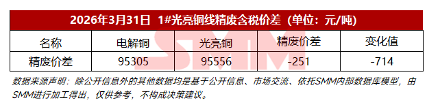 2026年3月31日1#光亮铜线精废价差【SMM数据】