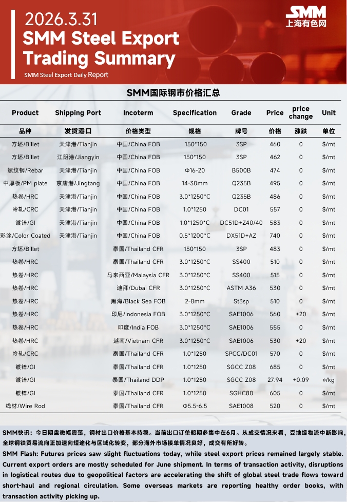 SMM快讯:今日期盘微幅震荡,钢材出口价格基本持稳。当前出口订单船期多集中在6月。从成交情况来看,受地缘物流中断影响,全球钢铁贸易流向正加速向短途化与区域化转变,部分海外市场接单情况良好,成交有所好转。