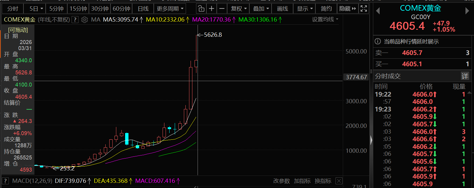 COMEX黄金2025年的年线涨幅为64.03%!2025年金价的大幅飙升,丰厚了不少贵金属企业的业绩。2026年年初,金价仍延续了2025年的上涨态势,不过,近来,受中东冲突带来的油价高企引发的美国通胀走高的担忧,进而对美联储降息预期降温,使得金价涨势出现回落,截至3月31日19:33分,COMEX黄金涨1.05%,报4605.4美元/盎司,其今年以来的年线涨幅暂时为6.09%。