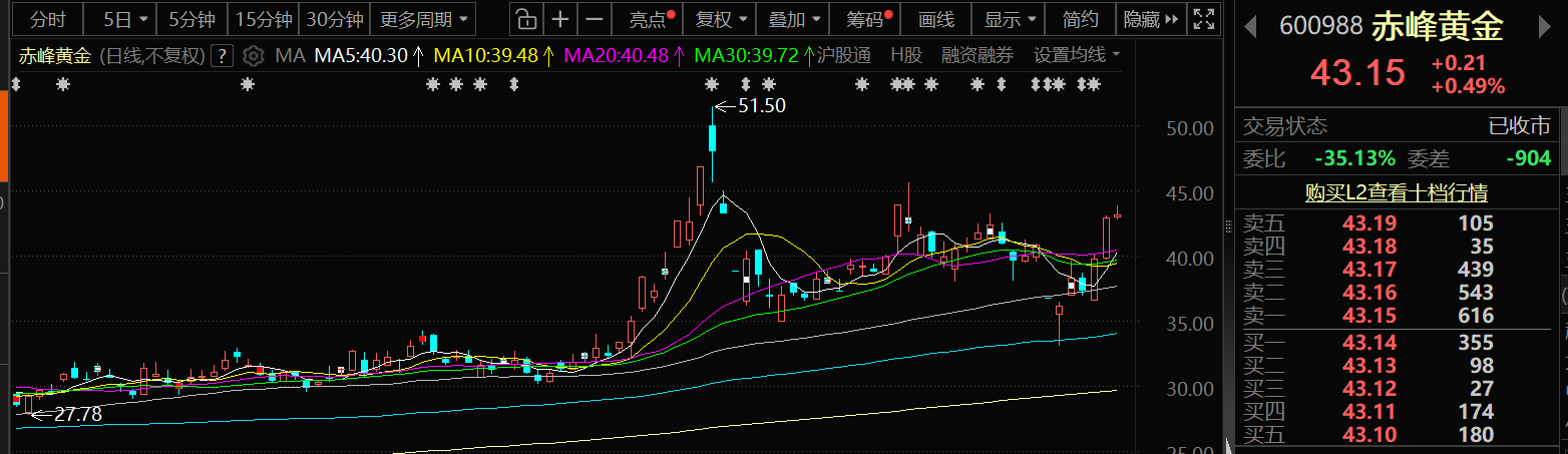 3月31日,赤峰黄金股价出现上涨,截至31日收盘,赤峰黄金涨0.49%,报43.15元/股。