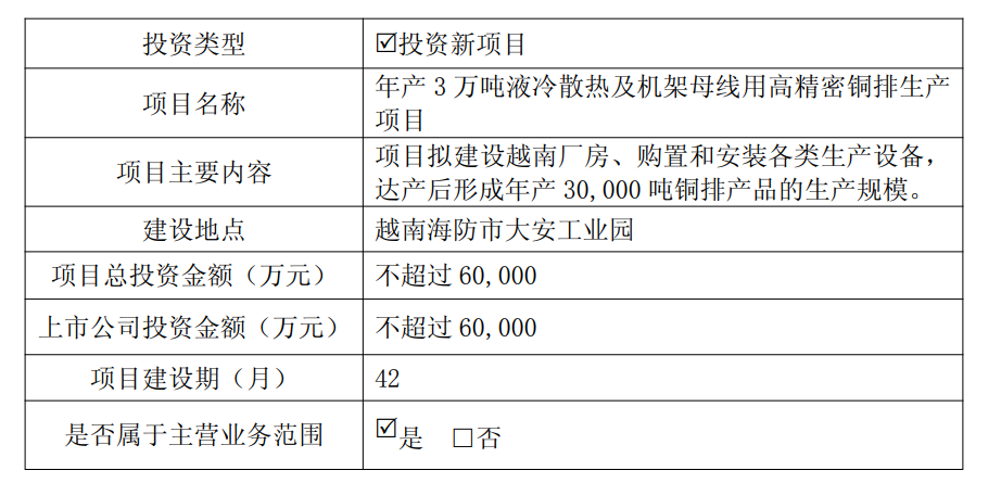 对于投资标的概况,金田股份的公告显示:公司拟在越南海防市大安工业园投资不超过 60,000 万人民币(8,690 万美元)建设年产 3 万吨液冷散热及机架母线用高精密铜排生产项目。