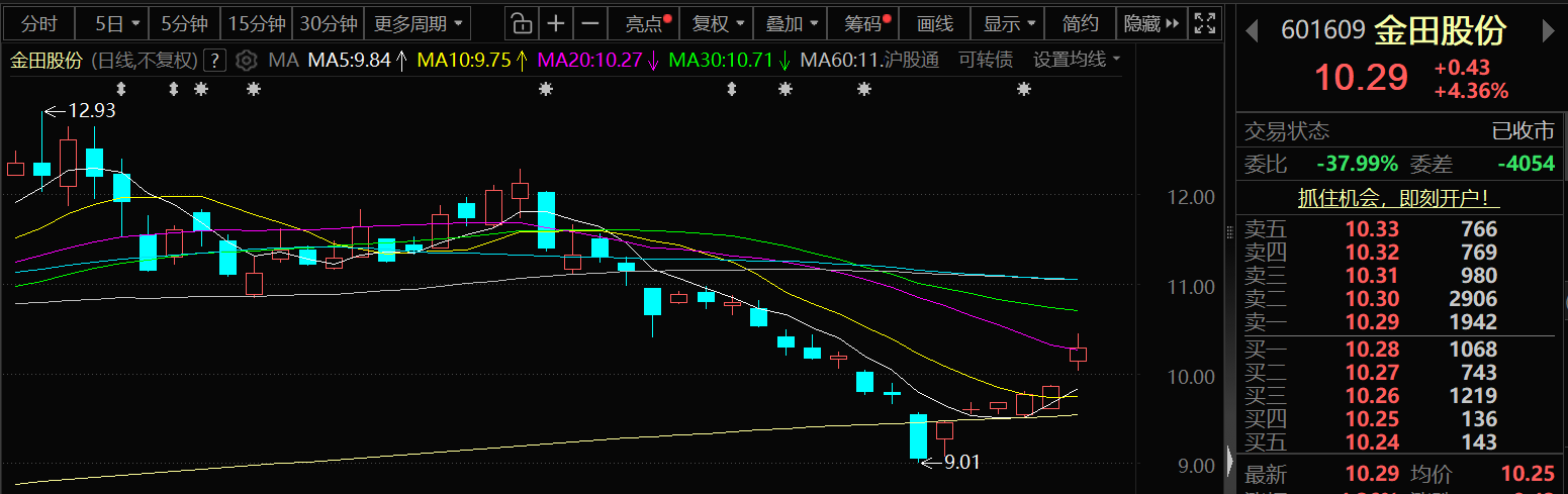 3月31日,金田股份的股价出现上涨,截至31日收盘,金田股份涨4.36%,报10.29元/股。