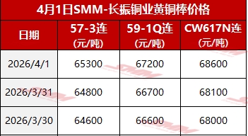 【SMM价格】2026年4月1日长振黄铜棒价格