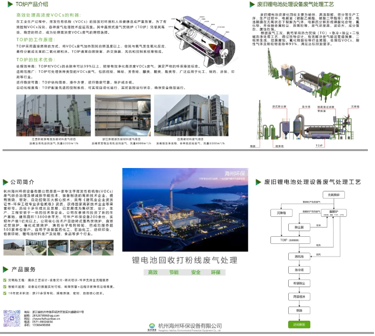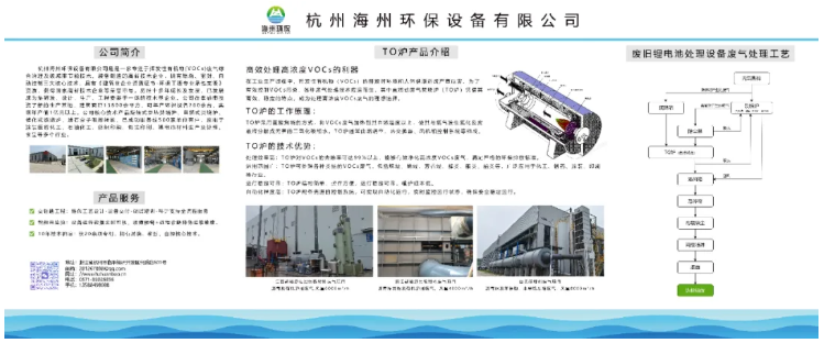 杭州海州环保设备有限公司是一家专注废气综合治理及碳减排节能技术、装备制造的高新技术企业,拥有燃烧、密封、自控三大核心技术,具有《环保工程专业承包贰级》资质。历经十余年的成长,公司已发展成为一家集研发、设计、生产、工程安装于一体的技术型企业。公司核心技术产品蓄热式焚烧炉、直燃式焚烧炉、催化燃烧炉、沸石分子筛吸附转轮、废旧锂电池再生利用成套装备已成功服务超500家单位客户,广泛应用于表面涂装、医药化工、石油化工、包装印刷、新能源制造、锂电池再生回收等多个行业。