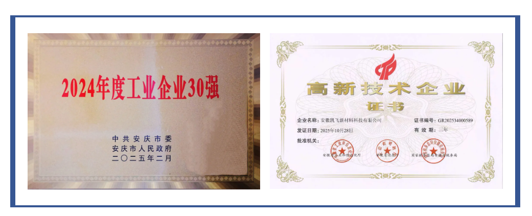2025年凯飞新材料产值超14亿元,纳税超1.9亿元。荣获高新技术企业、安徽省专精特新中小企业、中国人民银行AAA信用等级、安徽省创新型中小企业、2025安庆企业50强、安庆市2024年度工业企业30强、安庆迎江区2024年度高质量发展领军企业等荣誉,并获得19项专利。