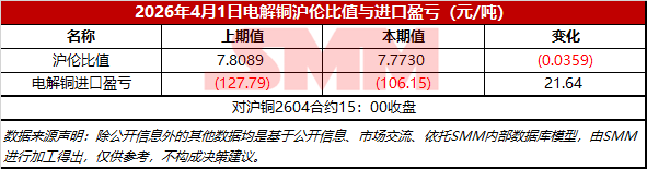 2026年4月1日电解铜沪伦比值与进口盈亏【SMM价格】