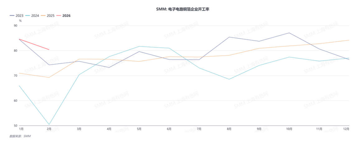 据SMM,2026年2月中国铜箔企业的开工率环比下降,同比上升明显。 2月因春节因素开工率季节性下滑,但行业开工水平远高于往年同期。终端需求来看,虽各端口均有季节性走弱,但回撤幅度表现温和。动力端头部厂商在海外订单与重点车型保供支撑下维持相对韧性;储能端国内终端存量项目交付提供刚需支撑;AI服务器等高端产业热度不减。 SMM预计3月铜箔开工率将重新回升并有望超过9成。》点击查看详情