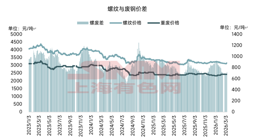 废钢作为短流程电炉厂炼钢的核心原料,其价格走势整体与螺纹钢价格保持较高的联动性,但由于基本面传导节奏差异,以及螺纹钢具备一定金融属性导致波动相对更剧烈等因素影响,两者价差仍呈现明显的波动特征。