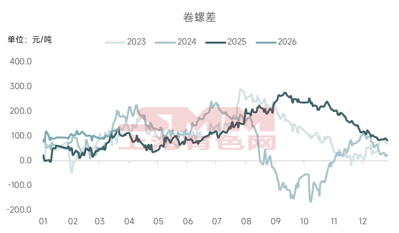 从历史价差走势来看,卷螺差也存在较为明显的季节性特征。通常情况下,卷螺差在夏季和冬季会出走扩态势,主要是因为这两个时间段雨水、雨雪天气较多,工地施工进度易受影响,而制造业加工多在室内车间进行,受天气扰动较小。相比之下,9月前后往往是卷螺差最有可能收窄的阶段,此时处于螺纹季节性需求旺季,价格表现通常强于热卷。