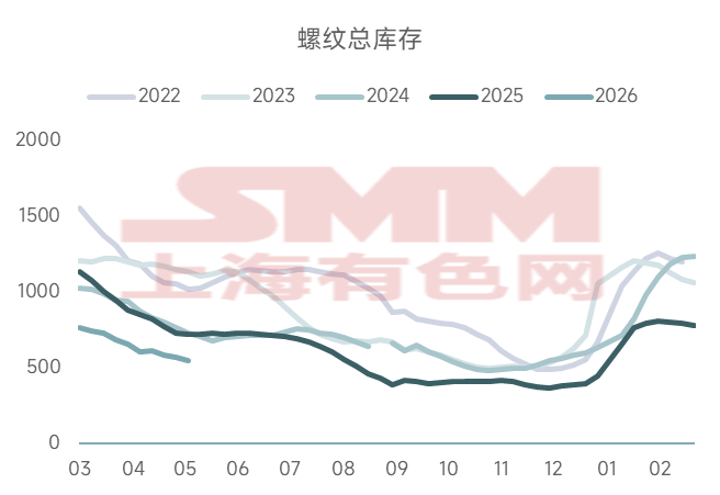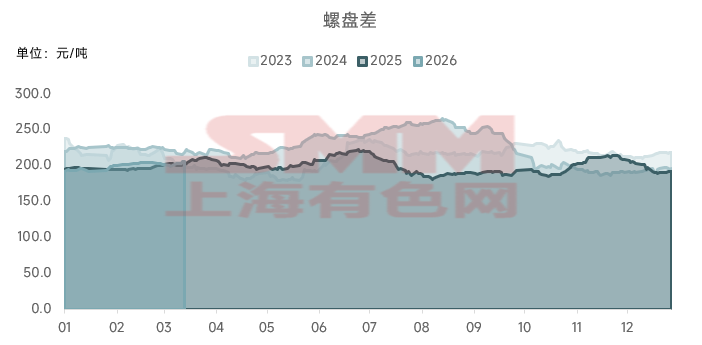 螺纹与盘螺同属建筑用长材,产品属性相近,但受机构与贸易商期现布局、钢厂生产计划调整、以及市场资源实际投放节奏等因素影响,两者之间仍会出现阶段性的价差波动。从过去三年价差变化来看,2023-2024年全国螺盘均价的价差围绕150-250元/吨区间波动,而2025-2026年价差则基本围绕150-220元/吨波动。可以发现与历史数据相比,当前螺盘价差波动幅度有所减弱,运行区间更趋收敛。主要是近些年房地产市场行情回落明显,盘螺实际使用需求受到压制;叠加盘螺金融属性不及螺纹,投机需求亦有明显减量,导致市场提货结构向螺纹倾斜,不敢多提盘螺资源, 使得螺盘价差波动逐步收窄。