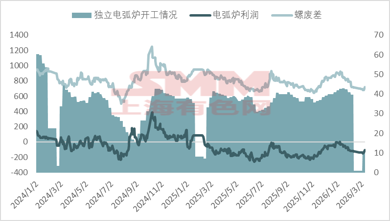 从螺废差、电炉利润及电炉开工率的联动表现来看,三者变化趋势高度协同,清晰反映短流程钢厂炼钢从成本、利润到生产决策的完整传导链条,是判断短期钢厂盈利与供给弹性的关键依据。结合往年数据规律看,当螺废价差收窄至750元/吨及以下时,电炉厂亏损将扩大至百元以上,钢厂或将进入大面积减产状态;当螺废价差在750-950元/吨区间波动时,各地区钢厂多跟随具体需求情况灵活调整开工时长;而当螺废价差突破950元/吨后,电炉利润将显著修复,生产端倾向增产。