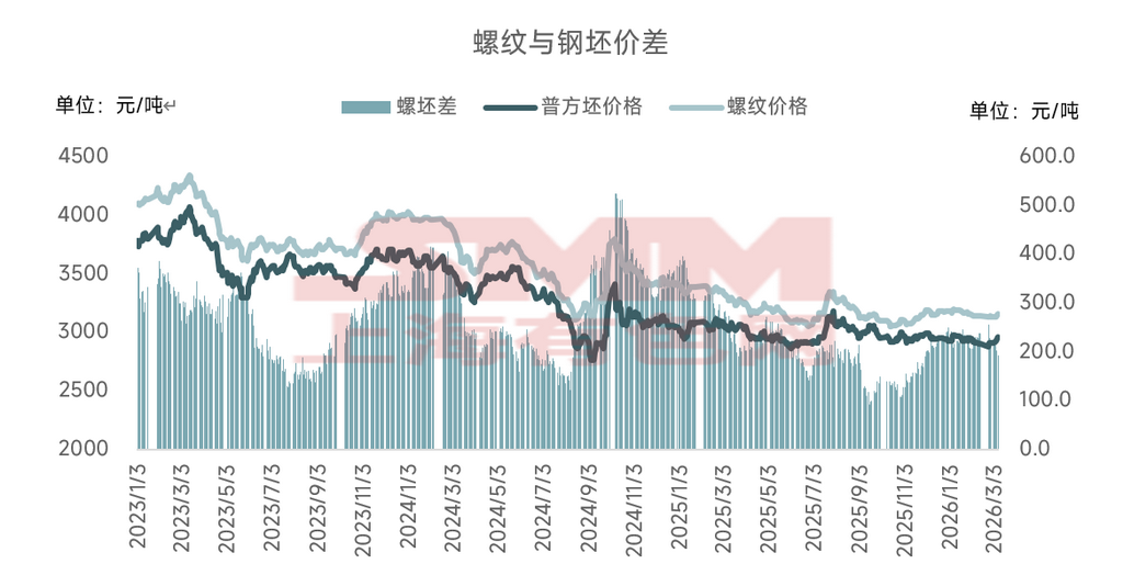 回顾近三年螺纹与钢坯价格走势,两者基本保持同涨同跌的特征。从生产流程的角度看,二者的理论价差来源于螺纹制造过程中的加工成本,主要包括加热及轧制费用,合计约为250元/吨。当螺坯价差收窄至轧制成本线以下时,生产螺纹的利润优势不及钢坯,钢厂倾向于减少螺纹排产直接外卖钢坯。以去年四季度为例,螺坯差由200元/吨收窄至140元/吨,东北地区钢厂因建材效益表现不佳,叠加钢坯出口需求支撑尚可,钢厂选择减量成材外销钢坯。反之,当螺坯价差显著高于轧制成本时,螺纹生产效益较钢坯更具优势,钢厂生产重心将重新向螺纹倾斜。
