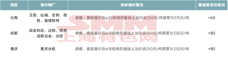 此外,钢厂主导调价也是影响螺盘价差的重要因素。各个地区的钢厂会根据自身排产计划、利润情况,对螺纹与盘螺进行差异化定价,进入直接引导两者价差波动。以近期西南市场为例,云南及川渝地区集中发函,调涨盘螺加价,带动螺盘差小幅走扩。