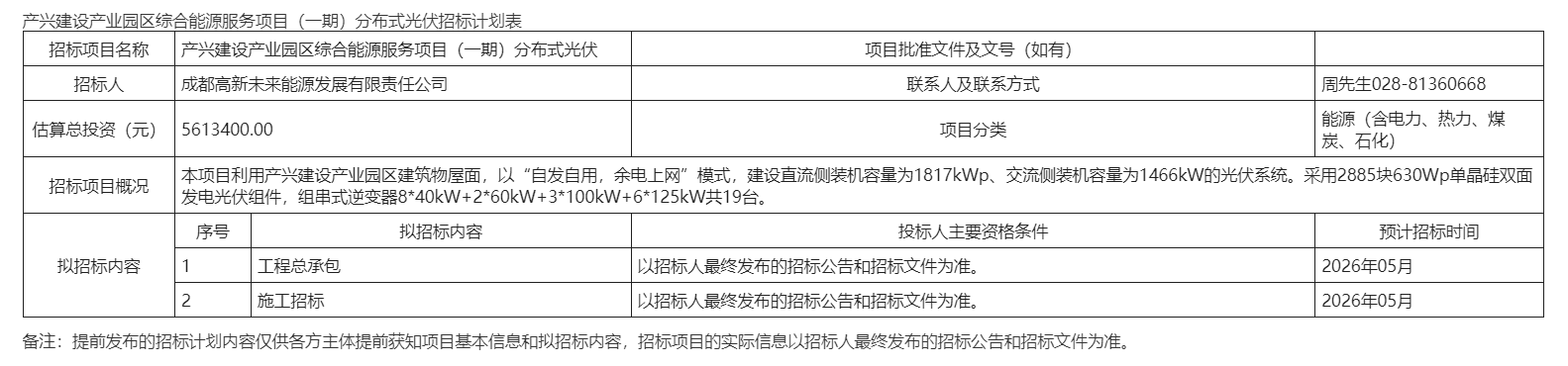 近日,产兴建设产业园区综合能源服务项目(一期)分布式光伏招标计划发布。招标项目详情:本项目利用产兴建设产业园区建筑物屋面,以“自发自用,余电上网”模式,建设直流侧装机容量为1817kWp、交流侧装机容量为1466kW的光伏系统。采用2885块630Wp单晶硅双面发电光伏组件,组串式逆变器8*40kW+2*60kW+3*100kW+6*125kW共19台。估算总投资额为5613400.00元,预计招标时间2026年05月。