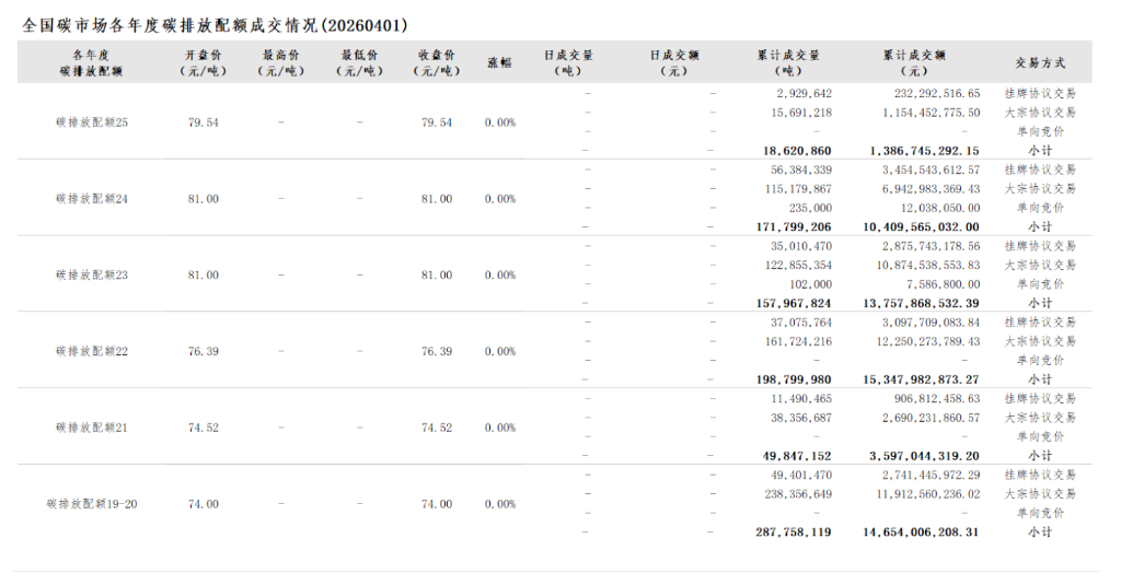 2026年1月1日至4月1日,全国碳市场碳排放配额成交量19,926,621吨,成交额1,490,594,025.75元。
