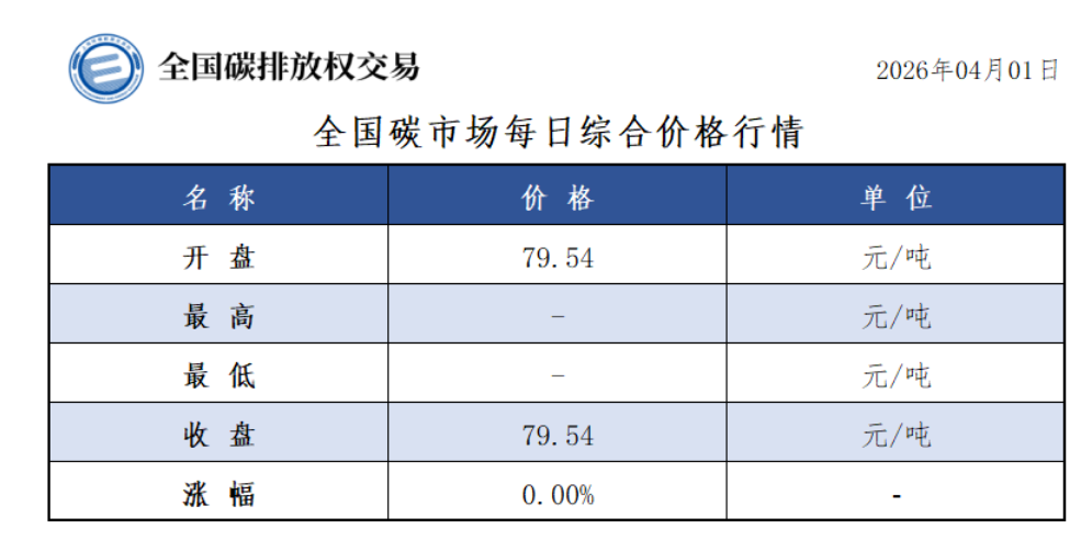 今日全国碳市场无成交,综合价格收盘价79.54元/吨。