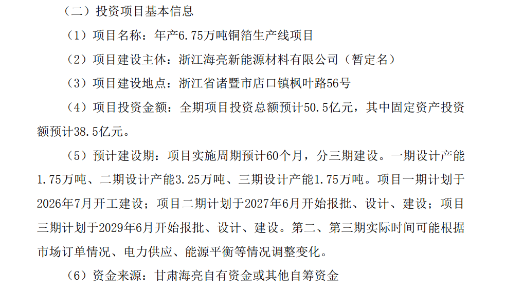 海亮股份4月1日发布的关于控股子公司对外投资的公告显示:公司之控股子公司甘肃海亮新能源材料有限公司拟在浙江省诸暨市投资建设年产6.75万吨铜箔生产线项目。本次投资项目拟由甘肃海亮投资设立全资子公司浙江海亮新能源材料有限公司(暂定名,以工商行政管理部门核准名称为准)作为实施主体,分三期进行建设,全部投产后将形成约6.75万吨/年电解铜箔生产能力。项目总投资额预计为50.5亿元,其中固定资产投资额预计38.5亿元。