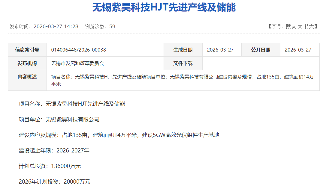 项目信息显示,无锡紫昊科技有限公司拟建设5GW高效光伏组件生产基地,计划总投资13.6亿元,其中2026年计划投资2亿元。