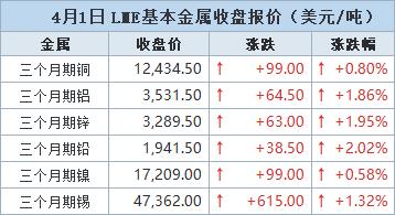 伦敦时间4月1日17:00(北京时间4月2日00:00),LME指标三个月期铜上涨99美元,或0.8%,收报每吨12,434.50美元,此前曾触及12,492.50美元,为3月18日以来最高水平。